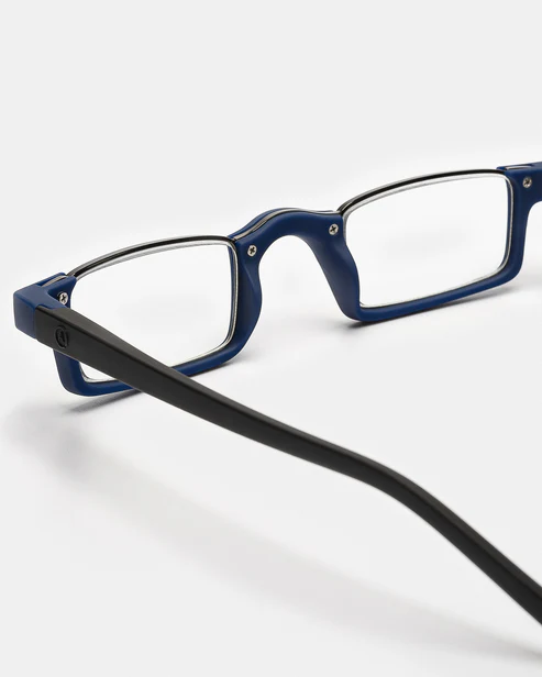 Os óculos de leitura Bridge Blue combinam inspiração arquitetônica com praticidade para o dia a dia. Com um formato quadrado, armação na cor azul na parte frontal e nas hastes, e um elegante aro de metal preto, este modelo oferece uma cor marcante equilibrada com uma estrutura moderna para uso diário.